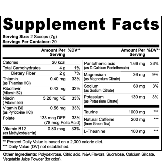 Thiamin (from Vitamin B1), Riboflavin (from Vitamin B2), Niacin (from Vitamin B3), Vitamin B6 (as Pyridoxal-5-phosphate), Folate (from Vitamin B9), Vitamin B12 (as Methylcobalamin), Pantothenic acid (from Vitamin B5), Calcium (from Calcium Ascorbate), Magnesium (from Magnesium Citrate), Sodium (from Sodium Citrate), Potassium (from Potassium Citrate), Taurine, Natural Caffeine (From Green Tea), L-theanine, Polydextrose, Citric acid, N&A Flavors, Sucralose, Calcium silicate, Fruit and Veggie blend (for color).